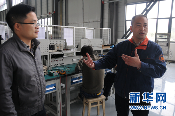 胡明华(右)与数控设备维修团队成员雷刚(左)在交流。新华网 聂晨静 摄