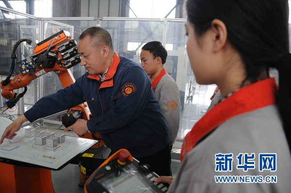 胡明华在机器人应用工程实验室里指导学生们进行机器人操作学习。新华网 聂晨静 摄