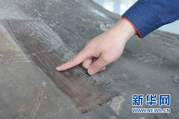 胡明华为记者展示用自动编程自适应机器人自动打磨系统打磨的铸锻件表面部分。新华网 聂晨静 摄