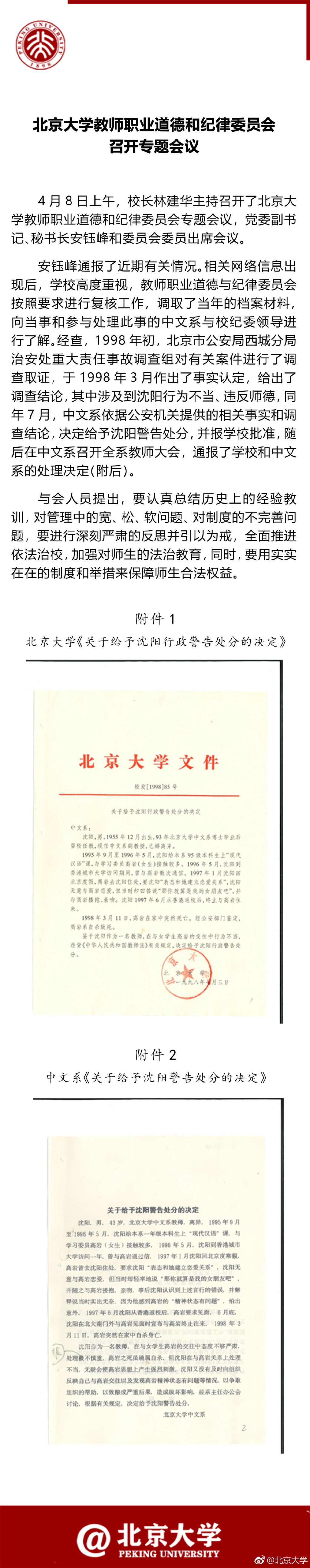 据北京大学官方微博消息,北京大学教师职业道德和纪律委员会今日召开专题会议 ,通报“沈阳事件”,并出示了当年对其警告处分的决定。