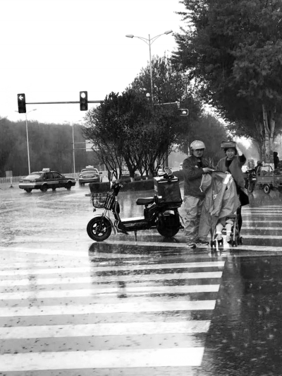 4月12日下午,宁夏银川普降春雨。在上海路与正源街的交叉路口附近,一位没有打伞的女士推着婴儿车正在等红灯。忽然雨势变大,一位外卖小哥正好路过,连忙停下车脱下外套,轻轻罩在了婴儿车上方,为孩子遮雨,并将母子护送到不远处的小区门口。