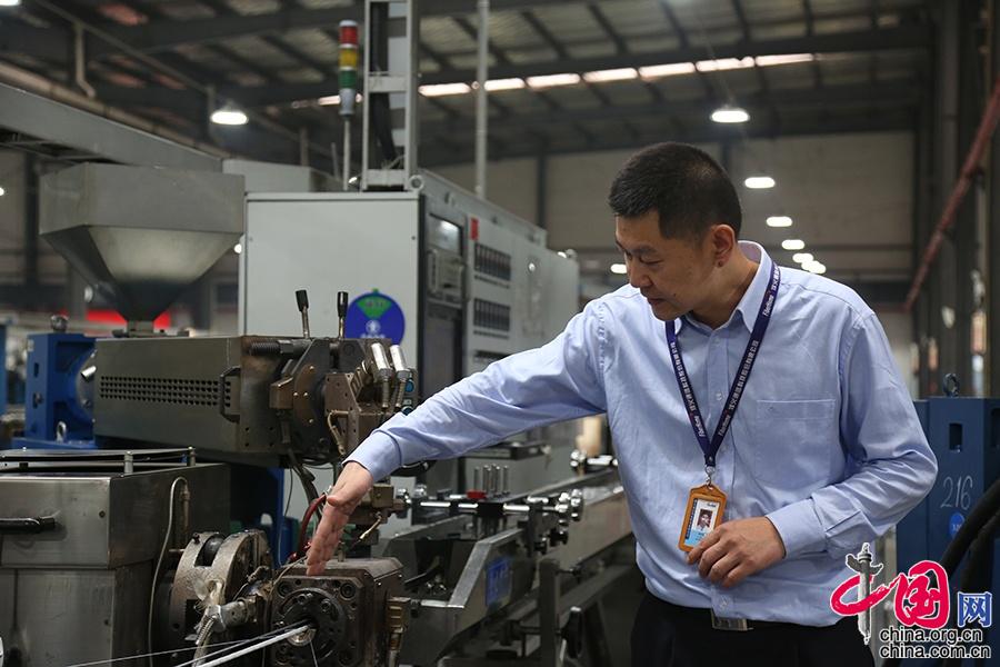 李诗愈向记者介绍光纤“穿衣”工艺。中国网记者 杨楠摄影