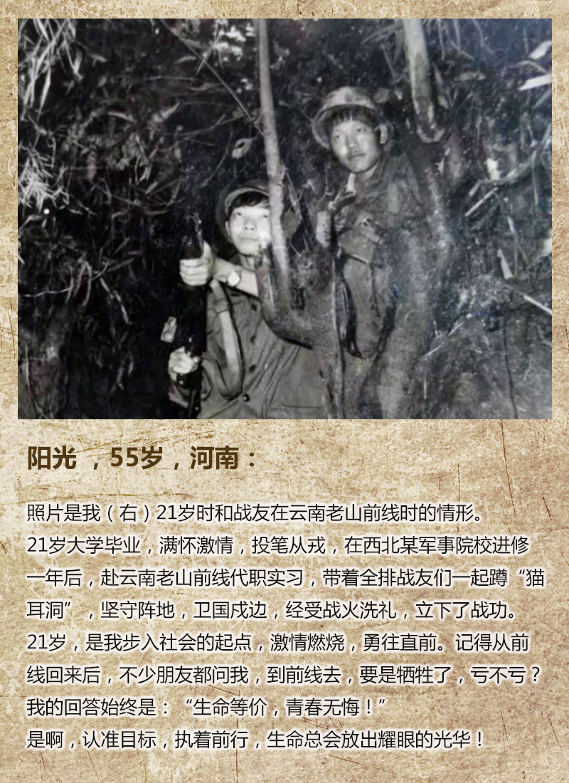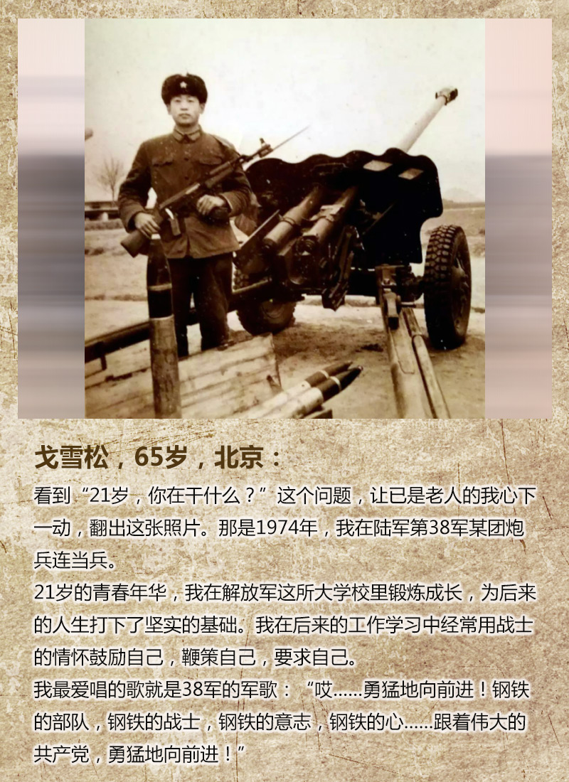 #21岁的我#【电影也拍不出来的芳华!爸妈爷奶辈的21岁原来是这样的】21岁,你在干什么?问题一发出,不仅有大批年轻人来分享故事,就连他们的爸妈爷奶辈也坐不住了!来看看他们的21岁,绽放过怎样的芳华?他们的21岁,奉献青春保家卫国,这是不是让人热血沸腾?21岁的故事,我们继续等你分享!
