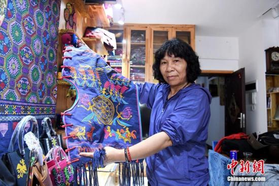 4月11日,广西南宁,壮锦工艺美术大师谭湘光展示壮锦服饰。谭湘光是广西宾阳人,16岁拜师学艺,织锦几十余年,其设计的手工壮锦系列产品曾多次在海外展出。中新社记者 俞靖 摄
