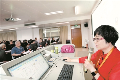 郭秀荣老师在广州老年大学给学员上电脑课。