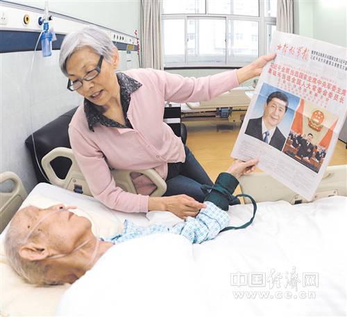 周智夫(左)生前在病床上不忘关心时事。 经济日报-中国经济网记者 姜天骄摄