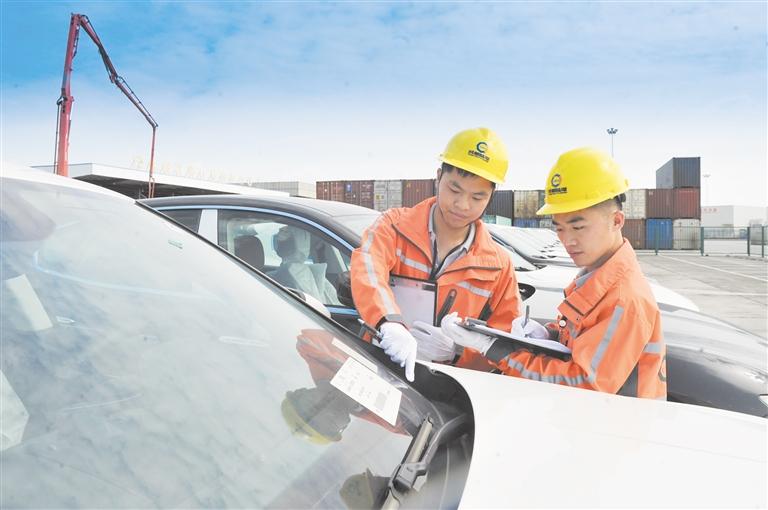 孙林(右)和同事点检平行进口汽车