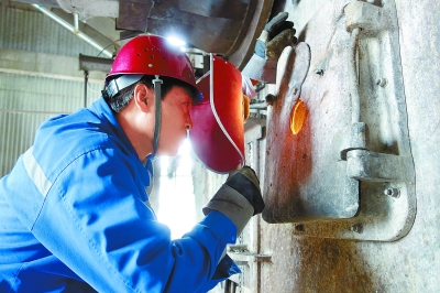 4月19日下午,金隅琉水环保科技有限公司生产车间,郭玉全沿着铁架扶梯爬至两层楼高的窑炉外。他手拿一把看火镜,迎着热浪透过直径10厘米左右的小孔观察窑炉内的火焰,“温度1400多度,燃烧情况很好。”只凭肉眼就能判断出水泥窑内的温度、通风、压力等各种状况,这是郭玉全的绝活儿。
