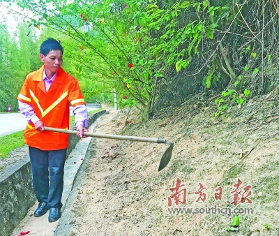 见到赖崇胜时,他正推着小推车清理路旁的杂草,并不时给路肩坝补土。给记者带路的丰顺县公路站工作人员说,赖班长在这段农村公路上护路已经30多年了。