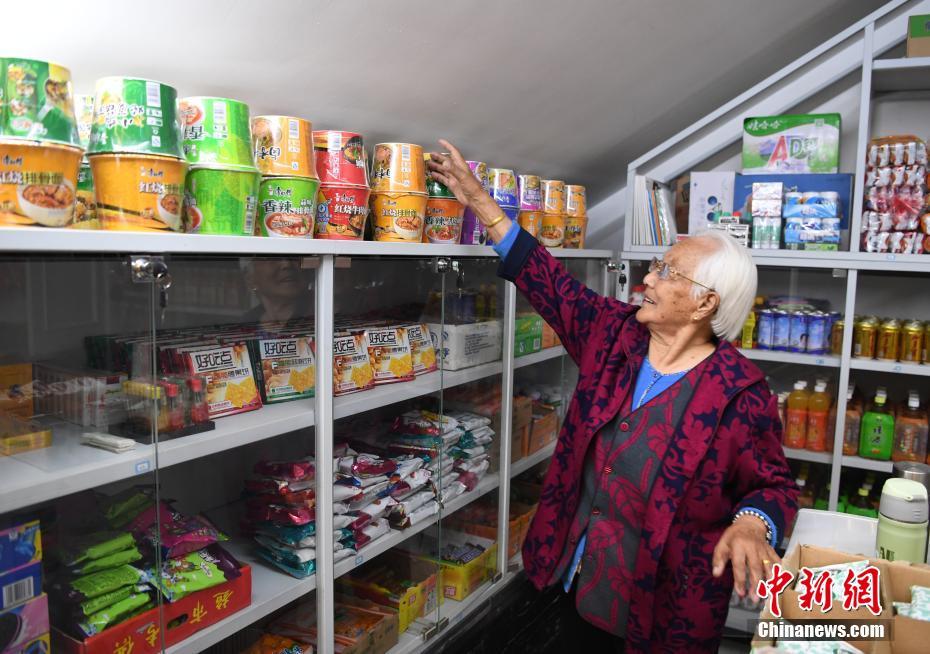 5月8日,在长春林田创客公园,姜乃君在超市售货。今年98岁高龄的姜乃君不久前通过众筹开办了一家超市,如今她每天早上八点都会来到超市“上班”,她将每个月店里利润的百分之五十作为流动资金,另外的百分之五十用来做慈善,买些衣物、生活用品等寄给贫困地区的孤寡老人和儿童福利院的孩子们。中新社记者 张瑶 摄