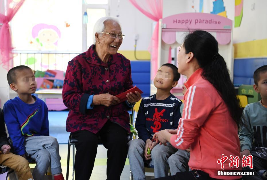 5月8日,姜乃君来到长春儿童福利院看望孩子。今年98岁高龄的姜乃君不久前通过众筹开办了一家超市,如今她每天早上八点都会来到超市“上班”,她将每个月店里利润的百分之五十作为流动资金,另外的百分之五十用来做慈善,买些衣物、生活用品等寄给贫困地区的孤寡老人和儿童福利院的孩子们。中新社记者 张瑶 摄