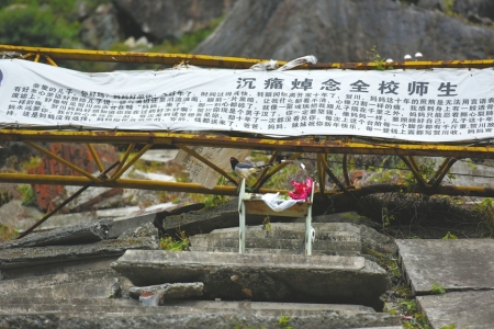 “这是当年北川中学的遗址,横幅是一位母亲写给遇难的儿子的,她每年都来挂3次,再过6天,她肯定还会来的。”地震遗址的讲解员景科凤已经记住那个母亲的身影,虽然已是无数次向访客谈起横幅的故事,但说起这段话时,她和访客们一样,眼里泛着泪花。