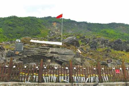 到北川老县城地震遗址祭奠的访客很多,从北川大酒店遗址旁边的街口进入,不远便是“5·12”纪念碑和纪念墙,纪念碑前摆满了菊花,纪念墙的后面就是景家山崩塌遗址,嶙峋的巨石堆砌成一个斜面,将原北川中学新区深埋在山体里,只有旗杆和篮球架还露在外面。