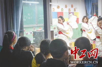 5月8日晚上,张红梅和同事们排练舞蹈,几名寄宿学生趴在窗户上观看。