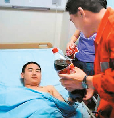 病榻上,手术刚成功结束的我惊喜地看到营救我的消防叔叔们兑现承诺,送来一大瓶冰冻的可口可乐。这帮帅哥,真够义气,真够爷们!