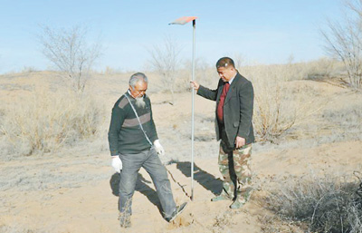 王银吉(右)和年近八旬的父亲王天昌在腾格里沙漠腹地种树。资料照片