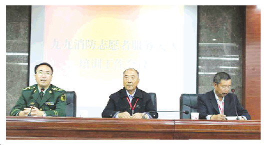 王梅平(中)参加九九消防志愿者服务大队培训工作会议。