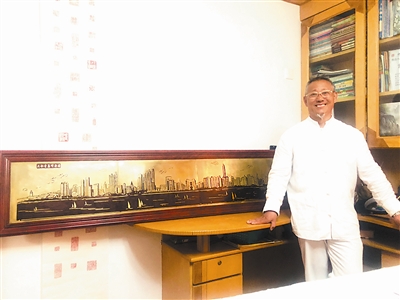从第一海水浴场到奥帆基地,一座座摩天大楼拔地而起……家住市北区水清沟街道的居民李守敬历时两个月,用一刀一锤将8公里的前海一线地标景点打造成2米长的铜版画《上合青岛峰会图》,用艺术的形式留住了最美上合青岛印象。