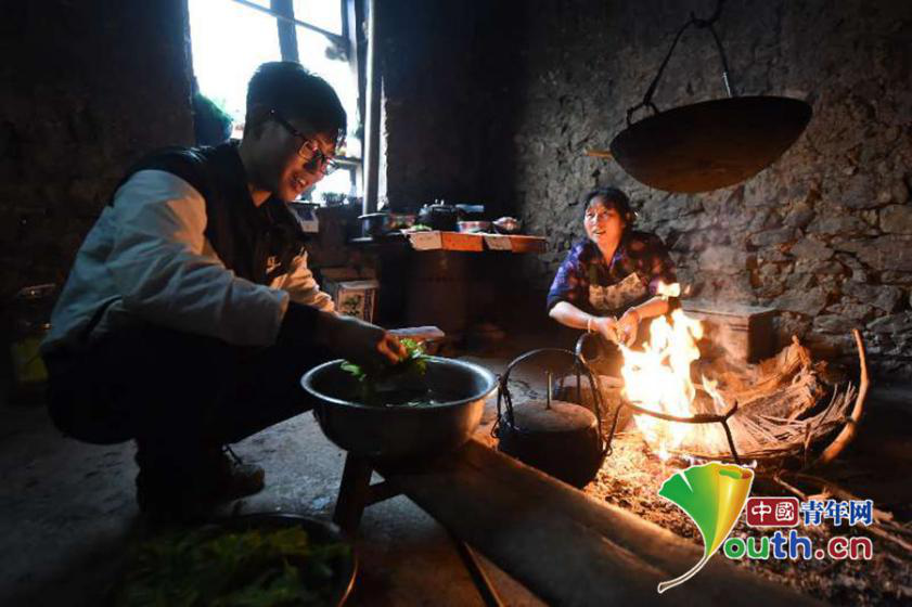 刘峻潇(左)和凉风村村民一起生火做饭。本人供图