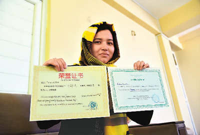 在阿富汗首都喀布尔伊本西纳大学,汉语系教师法尔扎娜·哈希展示她获得的荣誉证书。