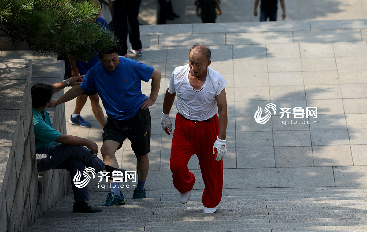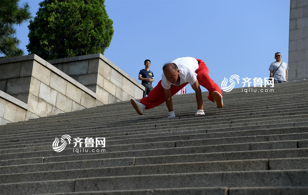 济南市英雄山英雄纪念碑南侧的台阶共有170多个,12年的坚持锻炼,让秘有仁仅用时42秒就可以完成。秘有仁这门“雪豹下山”绝技已经让他成为英雄山上的“名人”。(齐鲁网记者 张伟 穆广辉 实习记者 张诗晗 摄)