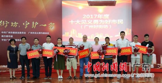 在此次颁奖礼上,广州市委政法委专职副书记陈思民等为10名当选的2017年度广州市见义勇为好市民(好街坊)颁奖。