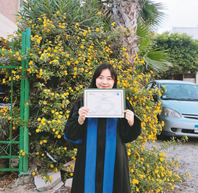 杨静茹虽然在国内已经学了两年阿拉伯语,但是到埃及后,语言交流还是有障碍。初到埃及,看到周围全是陌生面孔,她哪里都不敢去,什么也不敢说。杨静茹说:“刚到埃及的时候,当地的同学多讲方言。我听不懂,也不敢和同学交流。当地的饮食偏甜,我是北方人,因而在饮食上也不太习惯。总之,初到埃及遇到很多挑战,需要自己调整心态,不断适应。”