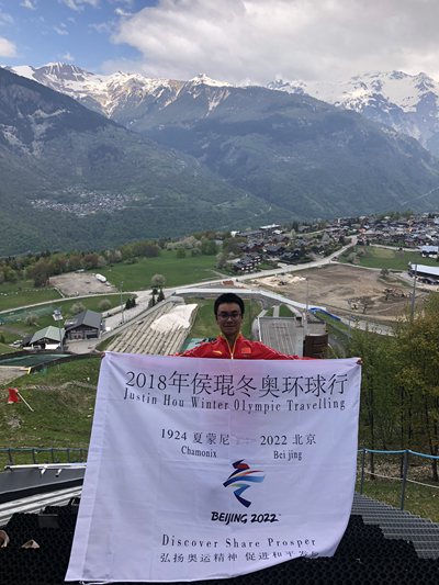 每一座城市的主要奥运标志物前,侯琨总会身穿绣奥运五环旗的运动衫、双手展开印着醒目标志的旗帜留影。