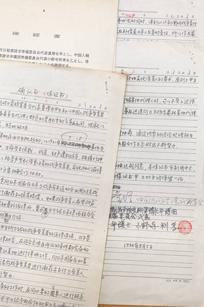 1994年,童增委托日本律师小野寺利孝代理中国受害者起诉日本政府和日本加害企业的协议书。中国民间对日索赔联合会供图