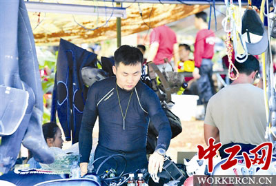 7月5日,在泰国清莱,一名来自中国的救援队成员准备潜入洞穴为救出被困人员提供帮助。泰国清莱府一支少年足球队的12名队员和1名教练6月23日进入清莱府一处山洞后失踪,泰国国内及中国、美国等国救援队参加搜救。7月2日,搜救队发现13名被困人员全部幸存。目前,来自中国的洞潜专家与其他国家同行正夜以继日向洞内输送物资。中国救援人员每天超负荷运转,连续水下工作5至6小时,而且经常是深夜作业。中国洞穴救援专家谭晓龙4日表示,目前孩子们身体比较虚弱,洞内情况复杂,将他们转移出洞的难度较大。