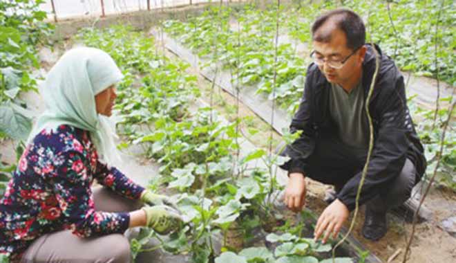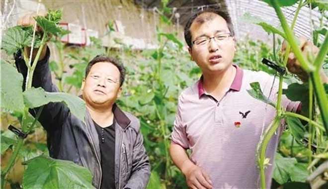 王生兵(右)在村民的日光温室中了解蔬菜生长和销售情况。 (来源:经济日报)
