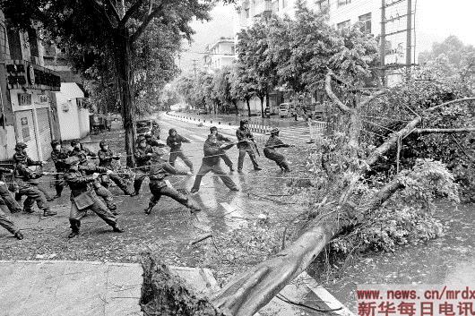 7月11日,在福建省宁德市蕉城区,武警官兵用绳索拖动倒伏树木。 新华社发(刘扬 摄)