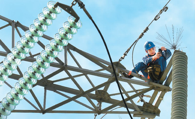 国网六安供电公司电力工人在220千伏供电线路电塔上作业。陈力 摄(人民视觉)
