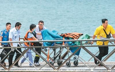 图为7月6日,在泰国普吉岛差隆码头,救援人员转移一名伤者。新华社/法新社