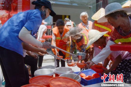 中新网南京7月19日电(记者 朱志庚)7月18日中午11时30分,入伏第二天高温达到37℃,江苏睢宁的环卫工人朱沛端忙完上午的保洁工作后,走进配有空调的免费午餐点,领了一份免费午餐——烧肉燕饺和炒土豆片,外加一份紫菜蛋汤和白米饭。
