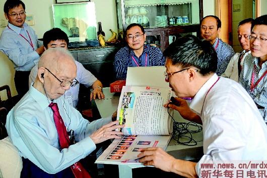 “中国百校之父”田家炳(前左)在家中接待内地田家炳中学校长访港团(2016年11月摄)。田家炳几十年持续支持教育事业的善举赢得广泛赞誉。他在香港获得过“感动香港十大人物”“爱心奖”等奖项,被授予香港特区政府最高荣誉大紫荆勋章。全国范围内,也曾被数十所大学颁授荣誉博士、院士头衔或聘为荣誉教授。新华社发