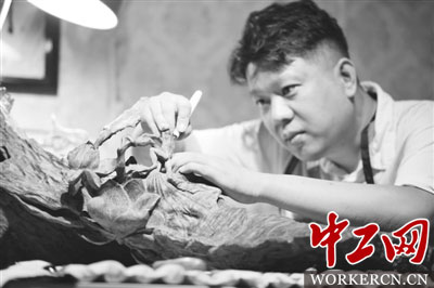 “郭氏木雕”传承人郭栋在工作室内进行木雕创作。其作品多以人物、动物、花鸟虫鱼为创作题材。近年来,非遗传承人郭栋在继承发扬传统木雕的基础上,不断创新,将木雕造型制成蜡模,通过加工制成铜雕艺术品,作品深受人们喜爱。
