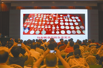劳模大讲堂上,全国劳模包起帆给劳模们展示自己获得的各类奖章,激励大家要学好本领、技能,建功新时代。
