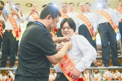 7月20日上午,参加首批全国劳模疗休养活动的200名劳模在中华全国总工会国际交流中心拍摄大合影。合影前,工作人员帮助一名劳模佩戴好奖章。