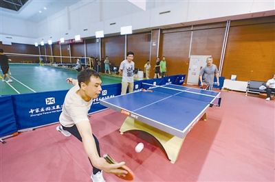 7月21日晚,劳模们组织了一场乒乓球友谊赛。图为来自抚顺的劳模于维立跨步击球。