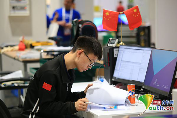 2017年10月,袁强代表中国参加第44届世界技能大赛工业控制项目比赛,图为袁强研究图纸试卷。本人供图