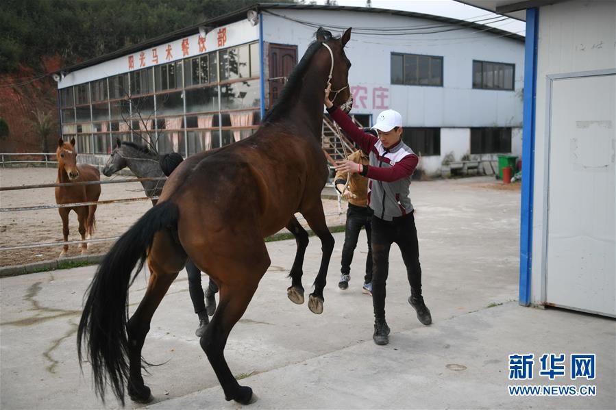 在江西省抚州市宜黄县阳光马术学校,一匹受伤的马因为害怕治疗又蹦又跳,学员黄万鹏在试图拉住它(3月14日摄)。新华社记者 周密 摄