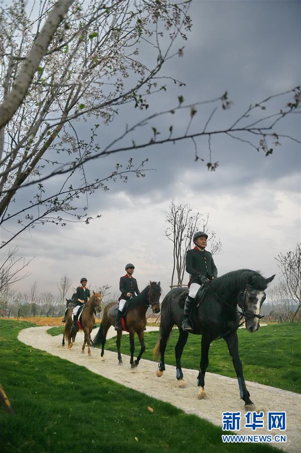 在江西省抚州市宜黄县阳光马术学校,学员们进行户外骑行(3月14日摄)。新华社记者 周密 摄