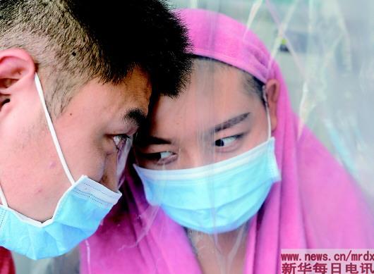 图一:在苏州永鼎医院病房,郑勇涛(左)和龚雪娟在一起(7月21日摄)。