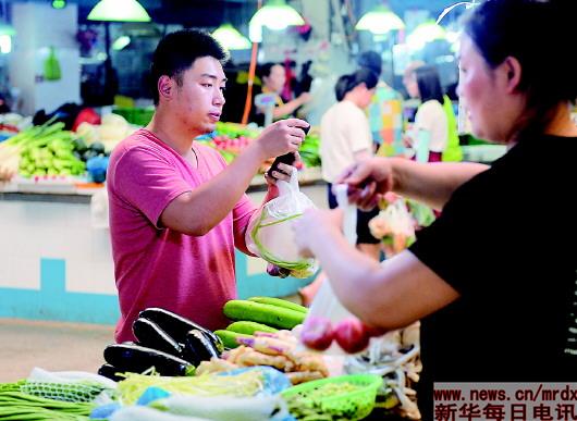 图三:在苏州永鼎医院附近的菜场,郑勇涛(左)在买菜,准备给龚雪娟做午饭(7月21日摄)。为了保证龚雪娟的营养,郑勇涛每天都去菜场买新鲜的食材,学着做龚雪娟爱吃的饭菜。