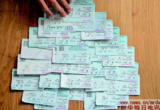 图四:郑勇涛在展示部分以前来苏州看龚雪娟的往返火车票(7月21日摄)。