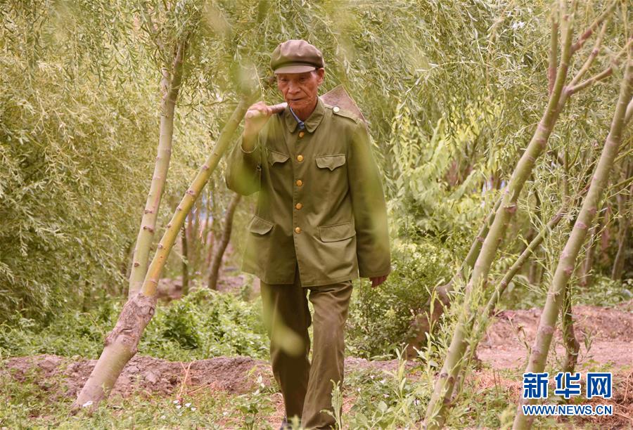 王成帮扛着工具穿过他培育的“成帮柳”林(7月27日摄)。育苗过程中,王成帮曾意外发现一株特别的柳树。它的树干青绿,冠幅如伞,一入冬季,柳枝金黄。他从树上掐下枝条,进行大规模培育。这种柳树后来被市政府命名为“成帮柳”。