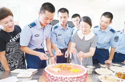 7月31日,浙江省德清县武康街道的“拥军好妈妈”来到高山一线的空军某部,和战士们一起包水饺、切蛋糕,送上节日的问候。近年来,浙江省德清县武康街道“拥军妈妈”们每逢“八一”、春节都会组织看望慰问子弟兵,感谢他们付出青春保家卫国。(中国妇女报·中国女网记者 姚改改/文 王正/摄影)