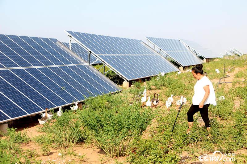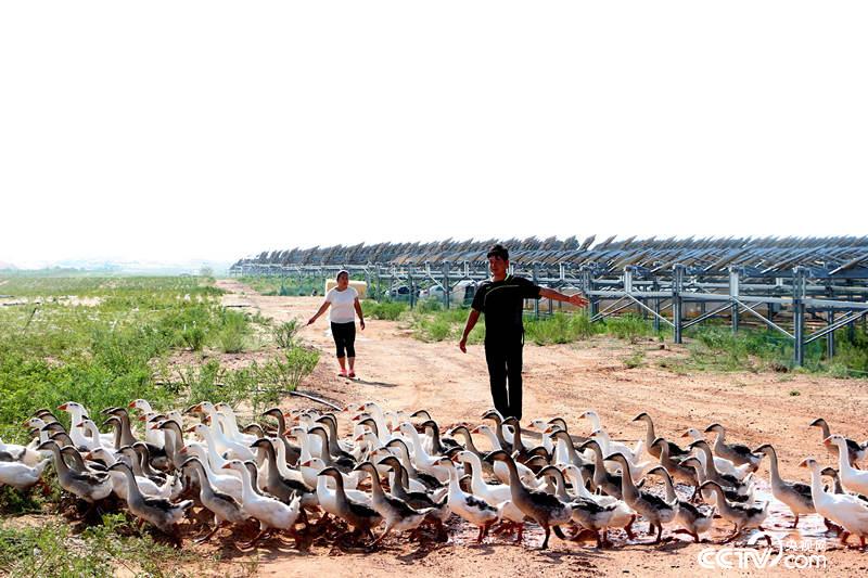 王双喜觉得可行,“鹅在这里养殖,水电方面不用花钱,鹅可以吃光伏板下长的杂草,节省了饲料钱,鹅粪还能直接当肥料。”他将5000只鹅赶到了光伏板下面,家里的大棚养殖1000多只。