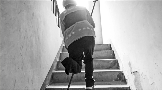 左手拄着“铁拐”,右手腕上勾着外卖的塑料袋,停放好电动车,他推开单元门,上了楼梯,一气呵成——7楼,只花了41秒。